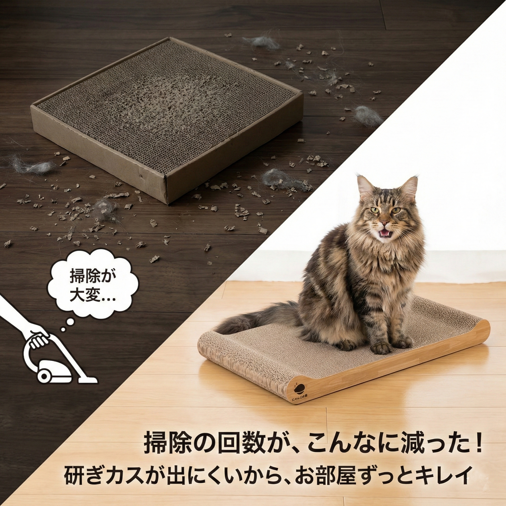【 研ぎクズゼロ 1年使える高耐久 大きな猫も快適 】一般的なダンボール製品よりもカスが出にくいよう工夫されています。裏表で約1年ご使用いただけます。※猫ちゃん1匹でご使用いただく場合【2024年12月リニューアル】より長く使っていただけるように段ボールの硬さを改良済み