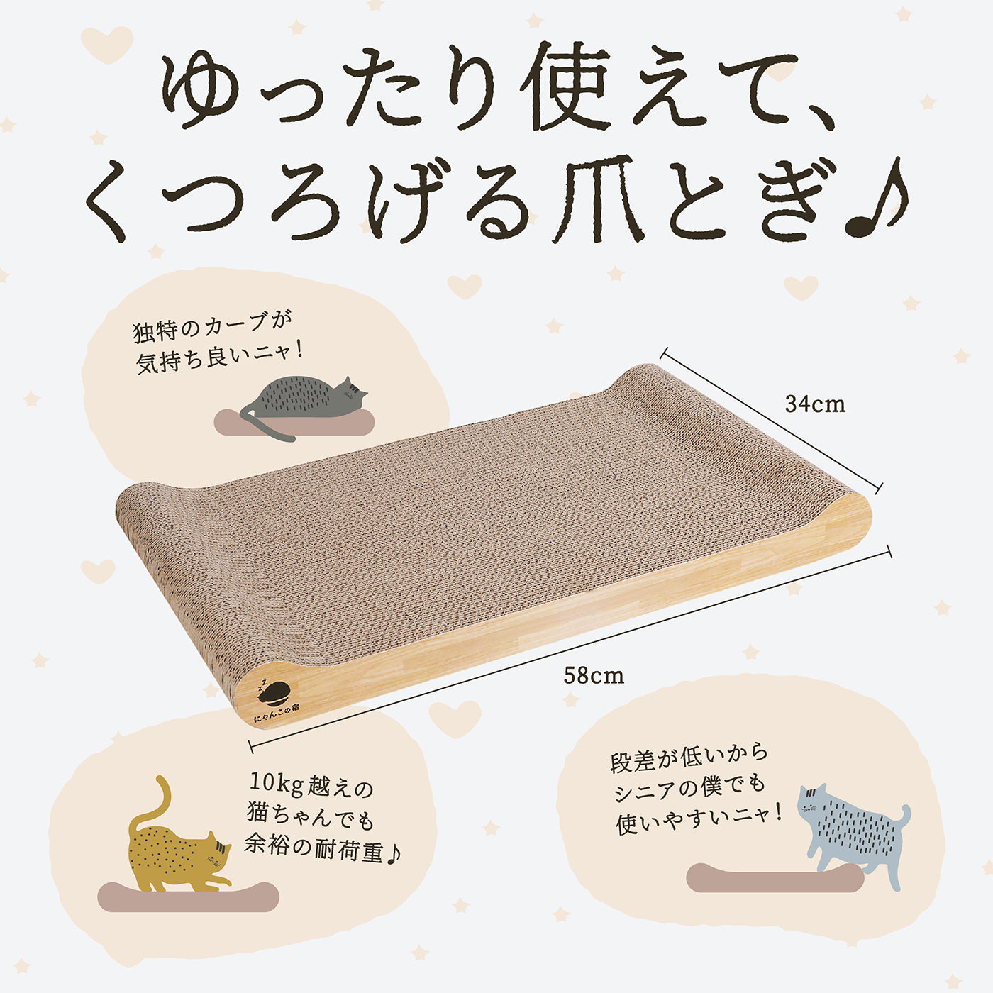 【 耐久性 】通常の段ボールの10倍の強度を誇る4層強化段ボールを使用しているので一般的な爪とぎより長持ち。だからカスが出にくい【猫ちゃんのからだにフィット】どちらの面も絶妙な角度のカーブで猫のやわらかいからだにフィットします。